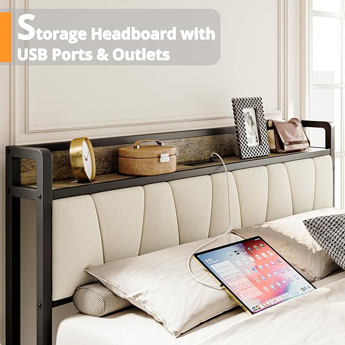 - 【Convenient Charging Station】The storage headboard is equipped with 2 standard plug outlets and 2 USB ports, making it easy to charge your devices and keep small items like phones, glasses, and books within reach. It comes with a 5.9ft long power supply cord for added convenience