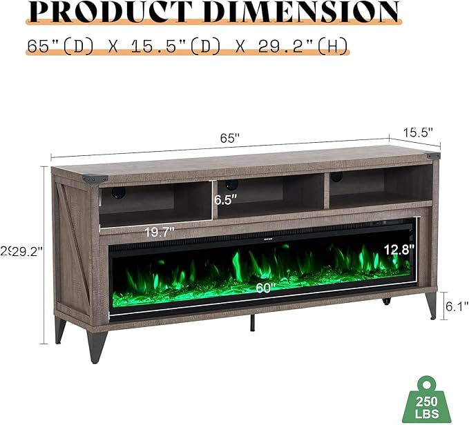 - Fireplace Dimension: 60"W x 5.5" D x 12.8"H. TV Cabinet Dimension: 65"W x 15.5"D x 29.2"H. Television stand for flat or curved screen TV up to 75", Max weight capacity 250lbs.