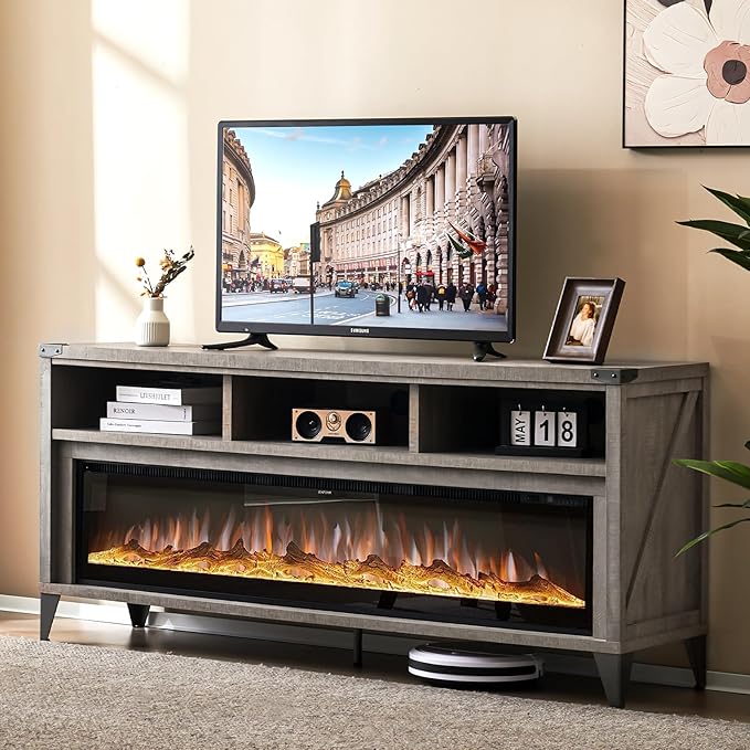 - Upgraded 60" wide glass electric fireplace insert, narrow air outlet maximizes the visual interface of the fireplace, blends in with the large TV cabinet, enhances the overall sense of atmosphere.