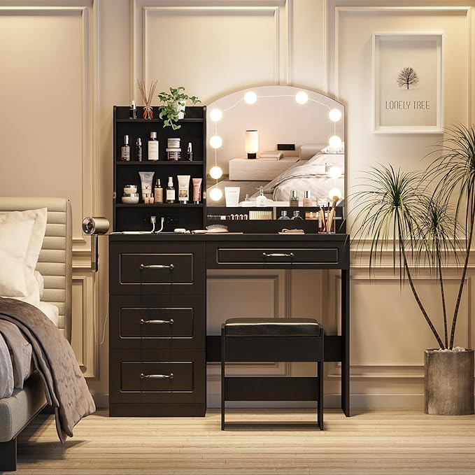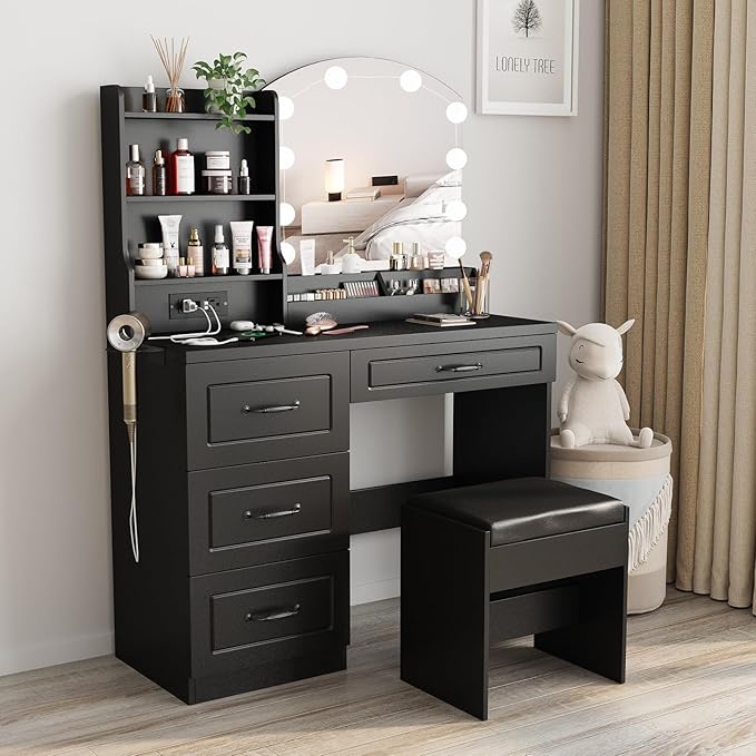 - Happy Experience & Professional Service: Elegant black vanity, make your bedroom more charming. step by step instructions, all parts and accessories are labeled, easy to set up. Any question, just contact seller to get satisfied solutions