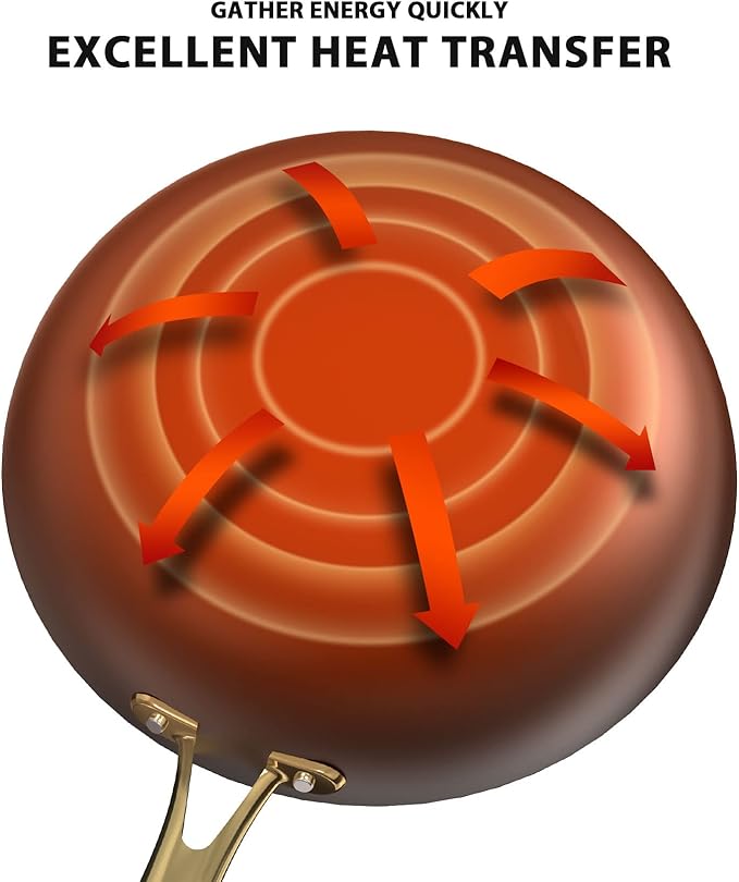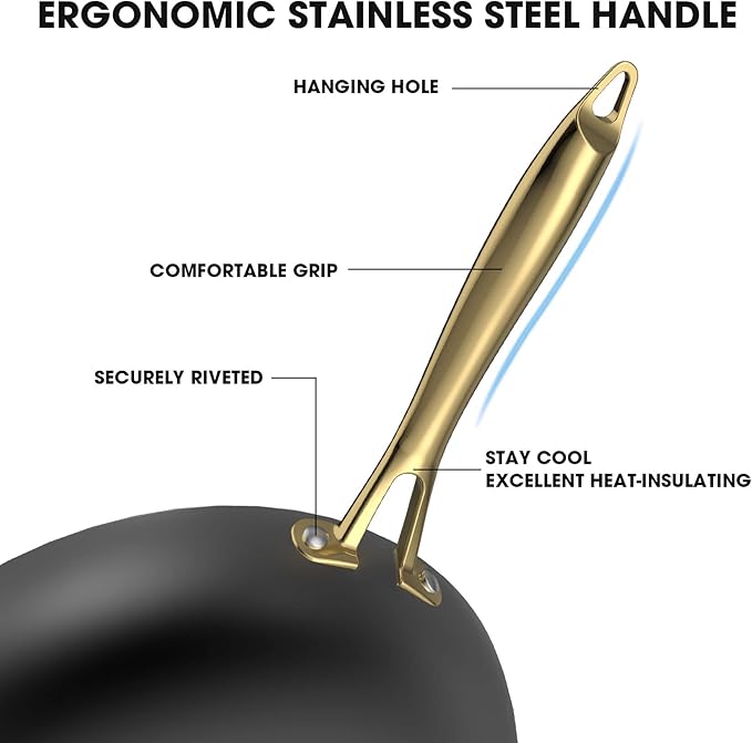 - ERGONOMIC STAY COOL HANDLE: The stainless steel handle of the nonstick pan is double riveted for stability, comfortable grip, stylish and durability. Always stays cool on the stovetop so no need to worry about burns. The hanging hole design made the nonstick skillet easy to hang up and convenient for saving kitchen space