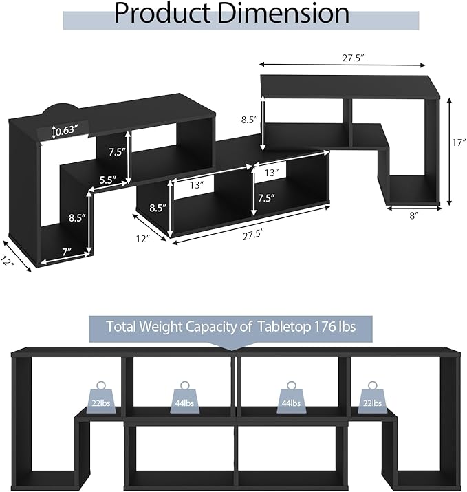 - 【Sturdy & Stable Structure】Composed of 0.6'' high quality engineered wood, this TV unit is sturdy and stable. The boards are connected by premium inserts and firmly fixed by hard screws. Premium material and stable structure ensure a large load capacity. Weight Capacity of Tabletop: 176 lbs. Weight Capacity of L-shaped Shelf: 22 lbs. Weight Capacity of Open Shelf: 44 lbs.