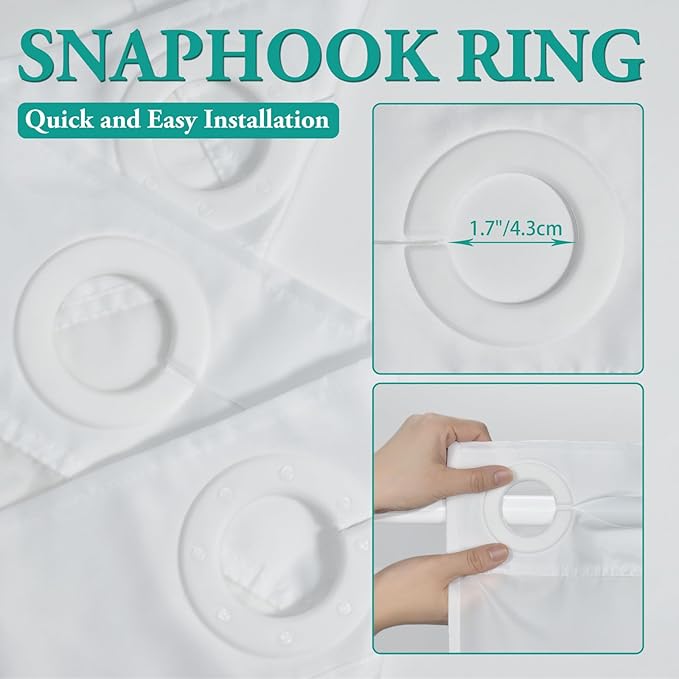 - NO Hook Design: set of shower curtain & snap on/off replaceable liner: no hooks needed design with built-in rings for easy on and off. snap-in waterproof fabric liner is removable when replacing.