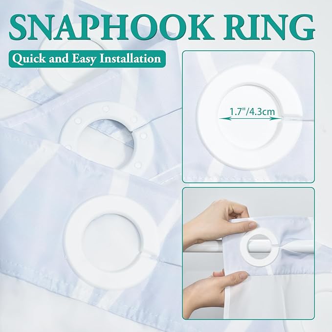 - NO Hook Design: set of shower curtain & snap on/off replaceable liner: no hooks needed design with built-in rings for easy on and off. snap-in waterproof fabric liner is removable when replacing.