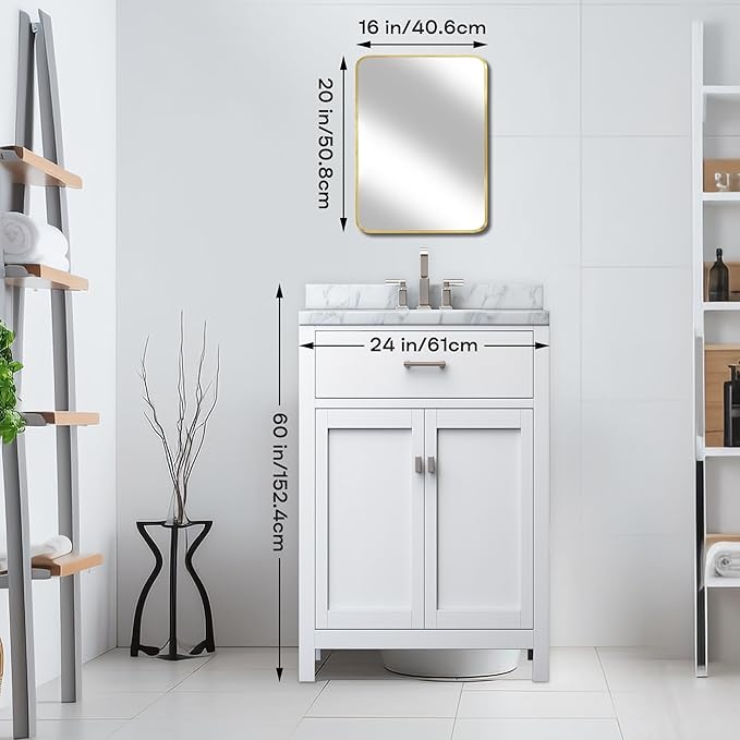 Wall Mount Mirror for Bathroom, Brushed Gold Metal Framed Rounded Corner Rectangular Vanity Mirror (16" x 20", Gold)