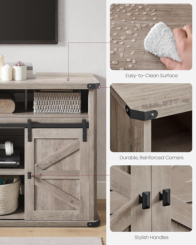 - [Ample and Flexible Storage] With 10 compartments, this TV cabinet neatly stores your DVDs, game consoles, and more. The barn doors slide freely to hide odds and ends for a clean look. 2 side shelves are adjustable for items of different sizes
