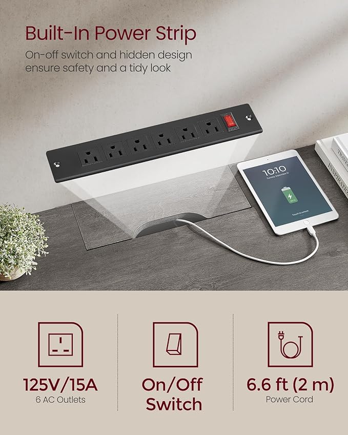 - [Built-In Charging Station] With 6 AC outlets, you can conveniently charge multiple devices at the same time. The on-off switch and overload protection provide added safety, while the hidden design helps maintain a tidy desktop