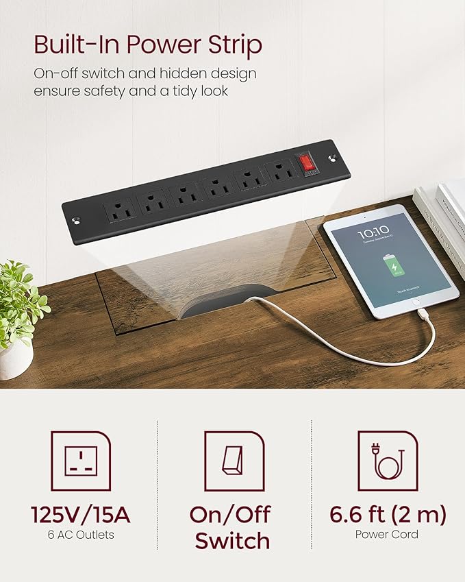 - [Built-In Charging Station] With 6 AC outlets, you can conveniently charge multiple devices at the same time. The on-off switch and overload protection provide added safety, while the hidden design helps maintain a tidy desktop