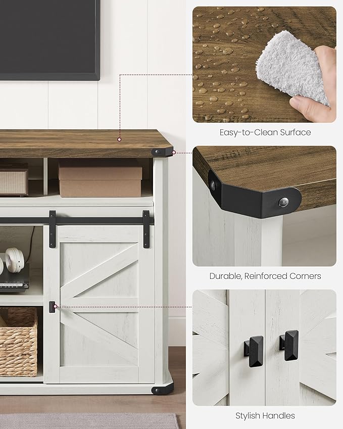 - [Ample and Flexible Storage] With 10 compartments, this TV cabinet neatly stores your DVDs, game consoles, and more. The barn doors slide freely to hide odds and ends for a clean look. 2 side shelves are adjustable for items of different sizes