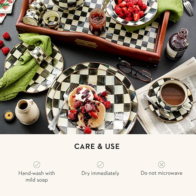 MACKENZIE-CHILDS Enamel Dinner Plate, Decorative Dinnerware Plate, 10 Inches, Set of 4, Black-and-White Courtly Check