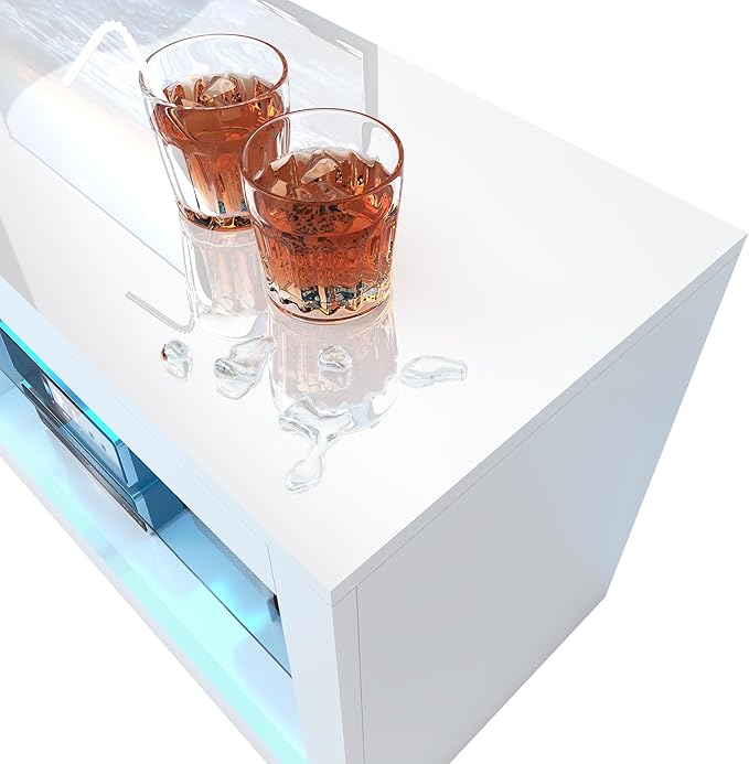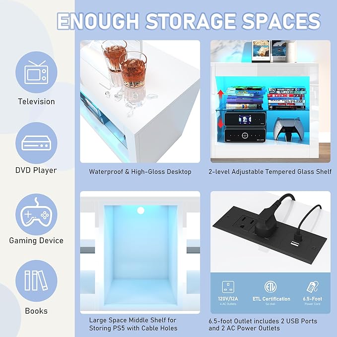 - High Gloss Design:LED gaming entertainment center made of High Gloss P2 grade particle board, scratch-resistant and waterproof, easy to maintain. The High Gloss desktop is flat and smooth with no gaps. Led TV stands desktops have 6.5-foot Power Outlets Including 2 USB and 2 three-hole sockets, enabling you to use your gaming device and TV more effectively. Modern high-gloss and minimalist structures also provide great stability and fashion