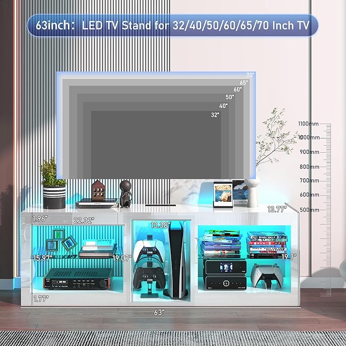 - Adjustable over 60,000-color LED TV Stand : LED tv stand has 20 colors and 22 lighting models that can be wirelessly controlled by the 44 key RGB remote control. The APP can control over 60,000 colors,The color's atmosphere can fluctuate with the sound, and the timing can be set. The entertainment center's LED TV cabinet is equipped with a variety of flashing modes, providing an excellent immersive experience for watching videos and games. Can be used for birthday, party, or other special day.