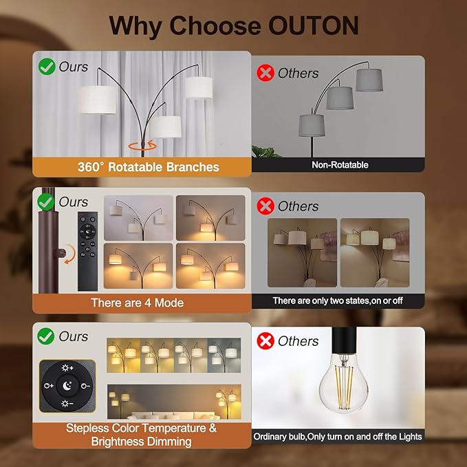- Remote Control &Magnetic design: OUTON modern arched floor lamp comes with a super handy remote control and three bulbs included. With the remote, you can easily turn the lamp on from across the room, enjoy the ambiance, and turn it off from your bed or sofa. The magnetic remote control can be conveniently attached to the lamp pole or any metal surface, ensuring it's always within reach when you need it