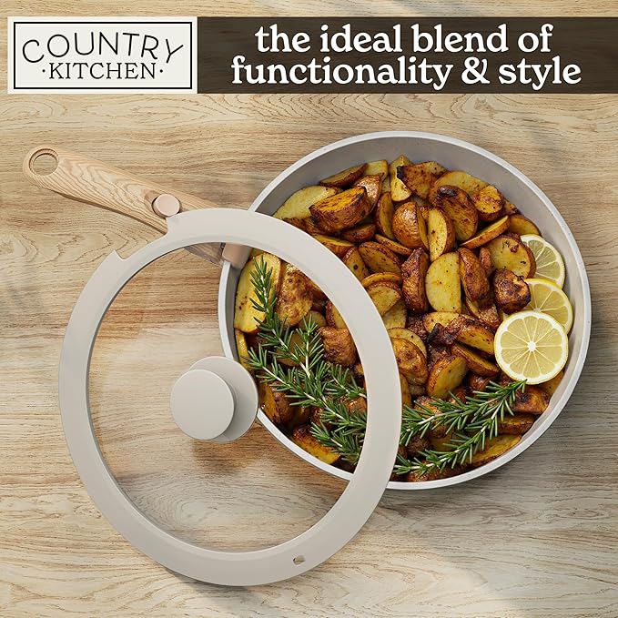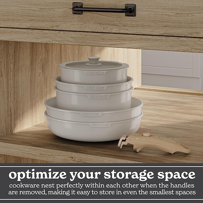 Country Kitchen Cookware Set with Removable Handle, Oven & RV Safe Pots and Pans Set, Cream Gold Speckle Wood Handle, Original