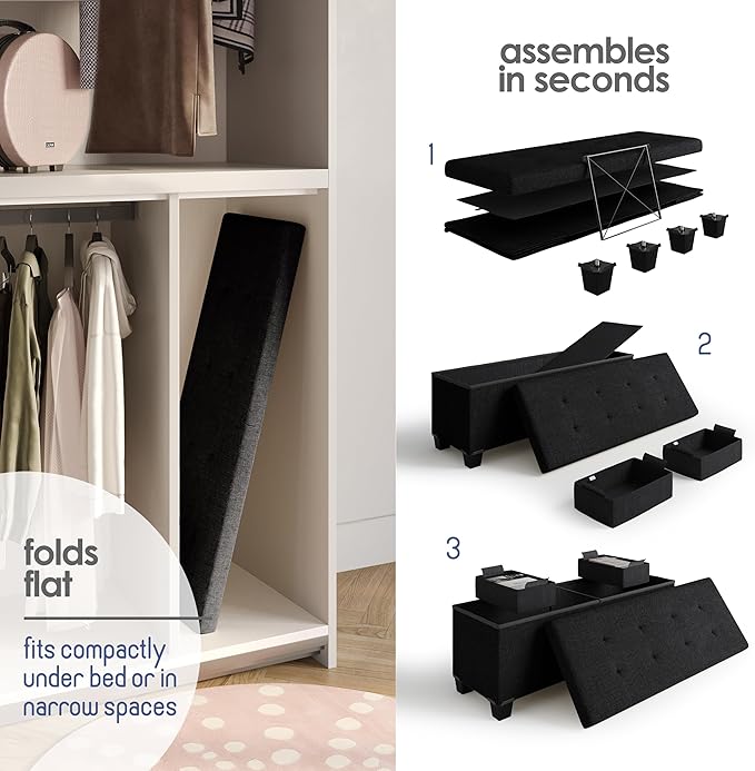 - Black Ottoman Storage Bench: This storage ottoman with storage for living room decor transforms your space and reduces clutter, and can be used as a storage ottoman bench or ottoman foot rest. Max weight 660 lbs.