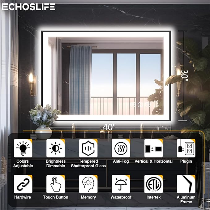 - [Space Black Aluminum Frame] Unlike other large LED bathroom mirrors, EchosLife's mirrors feature modern space black aluminum frames that create sophisticated atmospheres and add authentic touch of luxury.
