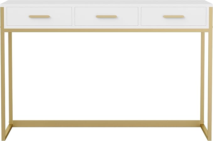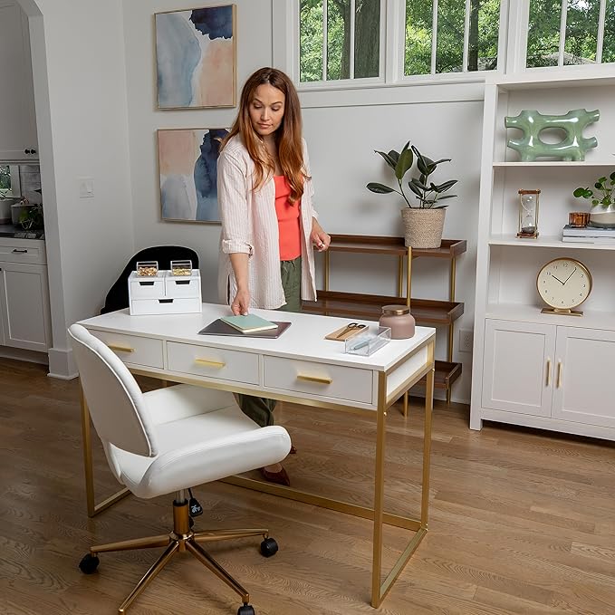 Martha Stewart Ollie Home Office Desk with 3 Drawers in White with Polished Brass Hardware