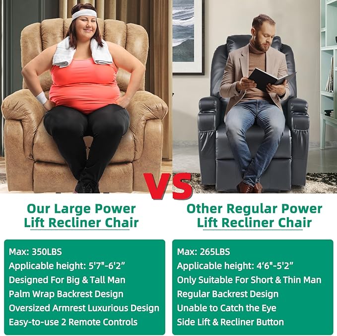 - 【Deeper Seat and Delicate Fabric】- This upgraded power lift chair is equipped with oversized and wider armrest, back and seat, which make it an ideal choice for people in bigger size. Overstuffed upholstery padded with high density sponge brings comfort, once you take a seat, you'll never want to get up. The bronzing suede fabric with a special process to bring a leather-like visual finish on the suede surface, soft to the touch, eco-friendly and breathable, wear-resistant and stain-resistant