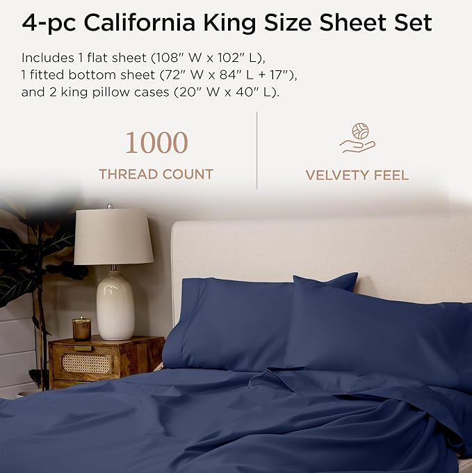 - ELEGANT BEDDING SET WITH SIZABLE DEEP POCKET BOTTOM SHEETS: Get the feeling of sleeping on luscious, thick clouds with our rich, high thread count sheet set. Each luxurious 4 piece California King size sheet set which includes 1 flat sheet (108" W x 102" L), 1 fitted sheet (72" W x 84" L + 17" deep pocket) and 2 King pillowcases (20" W x 40" L). Sleep without any worry of bunched up bedding on our snugly fitting bottom sheet. It has a generously sized deep pocket with an all-around elastic.
