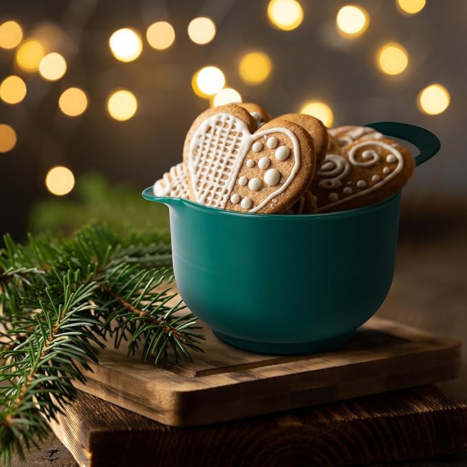 - Mixing Bowl with Handle: Good looking! Smart design for better experience on preparing and organization. Size included: 0.88 Qt, 1.32 Qt, 1.76 Qt and 2.64 Qt. A blue or green silicone scraper is included with the purchase of the Christmas mixing bowl (colours are sent at random and cannot be selected).