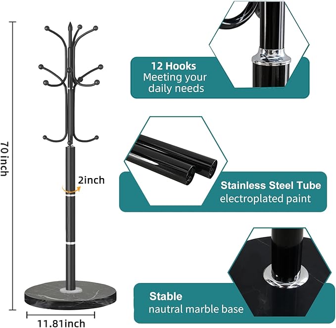 - EASY TO ASSEMBLE: The coat tree stand equipped with installation tools and instructions, quick to assemble. The coat stands can be easily installed in just 5-10 minutes. Then you will get a fancy standing coat tree stand that is both economical, beautiful and practical
