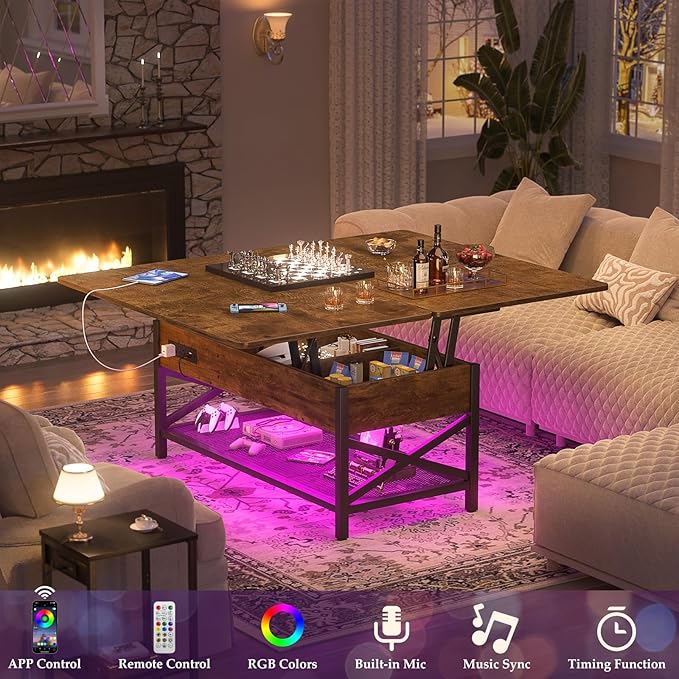 Aheaplus Coffee Table Lift Top with LED Light and Power Outlet, Multi-Function Coffee Table Converts to Dining Table, Center Table with Shelves for Living Room Reception Home Office, Rustic Brown