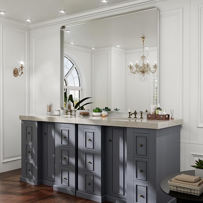 Hasipu Brushed Silver Bathroom Mirror 50x40 Inch Rounded Rectangle Vanity Mirror Metal Framed Wall Mirrors Anti-Rust Surface Mount (Horizontal/Vertical)