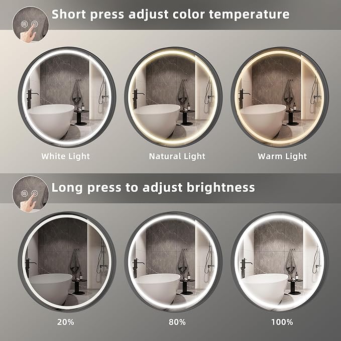 - 【3 Color Changeable & Brightness Dimmable】The smart lighted mirror is accessed to stepless color temperature and brightness adjustment. It's simple to operate by long-pressing the button "◎" to adjust the brightness and short-pressing the same button to change the color temperatures. There are 3 color temperature for option, warm light (3000k), natural light (4000k), and white light (6003k).