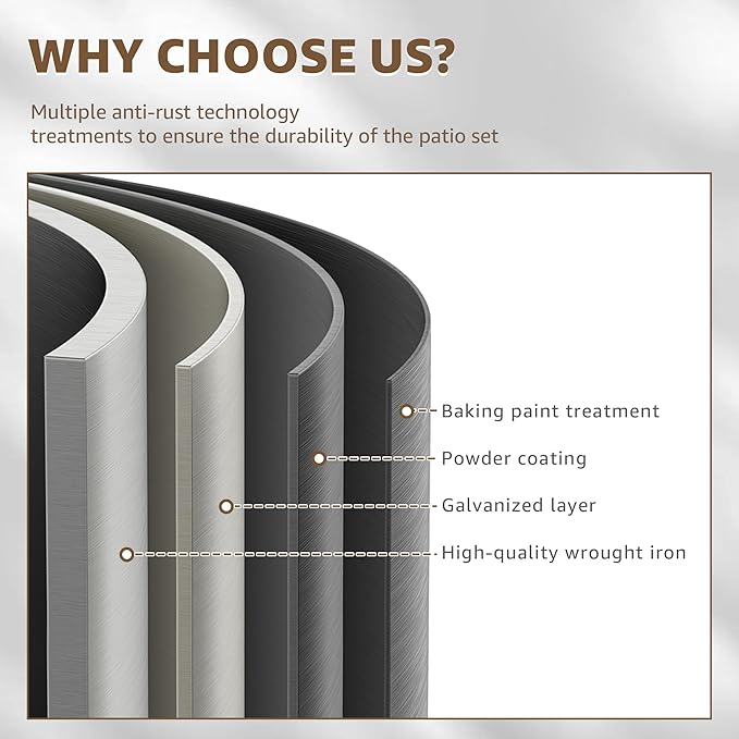 - Sturdy Steel Frame & Non-slip Feet - This modern outdoor dining table and chairs set is made of a sturdy steel frame that is strong and stable, e-coated to resist rust and weather, and has a weight capacity of up to 350 pounds per chair. The chairs come with non-slip feet for uneven surfaces and to prevent scratches on the floor.