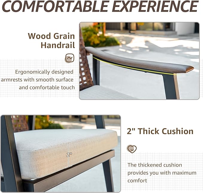 - Relax Your Back & Waist & Arms - Ergonomically designed rattan chairs conform to the curve of the human spine and fit your curves better. Each chair is equipped with a 2-inch thick cushion filled with high-density sponge, which relaxes the muscles and makes the body more comfortable, and soothes the fatigue of your body after a busy day.