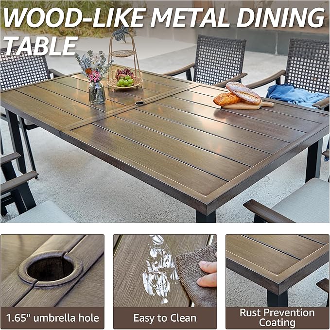 - Outdoor Dining Set for 6 - Make the appearance has the effect of imitation wood grain, power-coating technique which provides extended protection against rust, scratches, rain, and UV harm. The hand brushed wood grain finish aluminum armrests with ergonomic curve design can make your arm relax.