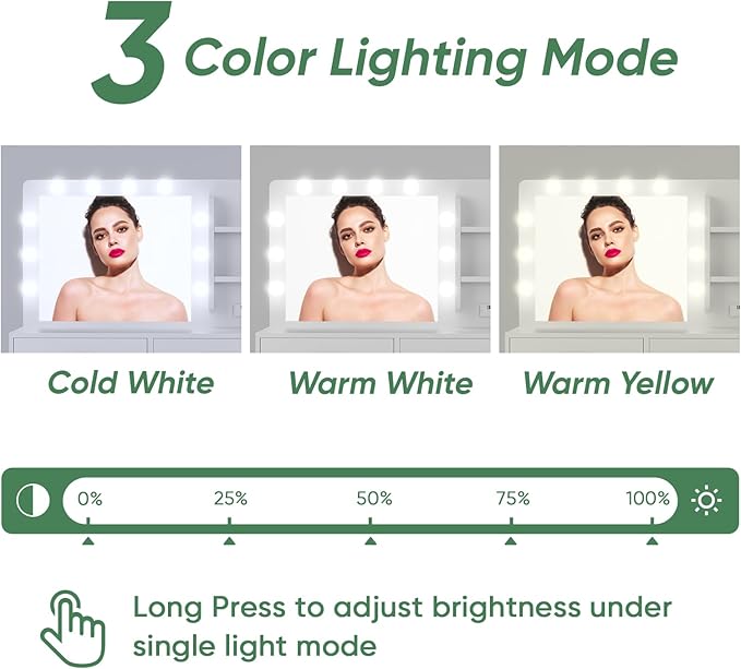 - 【3 Lighting & Brightness Adjustable】The makeup desk with drawers is equipped with a large mirror with 10 LED bulbs that provide you with 3 colors for option. Touch the button you can easily change the color mode and brightness, so you can experience the star-like makeup treatment, that will reflect your appearance more clearly and realistically.