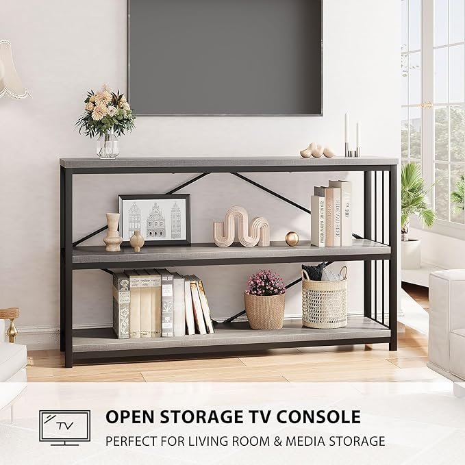 LVB Farmhouse Entryway Table, Metal Wood Console Table for Hallway, Industrial Rustic Sofa Table with 3-Tier Storage Shelf, Modern Entry Table for Foyer Front Home Living Room, Light Grey Oak, 47 inch