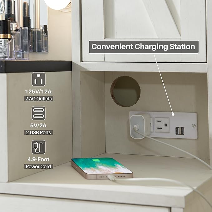 - 【Convenient Charging Station】Outfitted with a built-in power strip, 2 standard AC outlets and 2 USB ports are ready to provide great convenience for you to use hair straightener or blow dryer. Without moving your position, you coud finish your exquisite makeup and hair styling sitting on the soft vanity stool in set of this vanity desk
