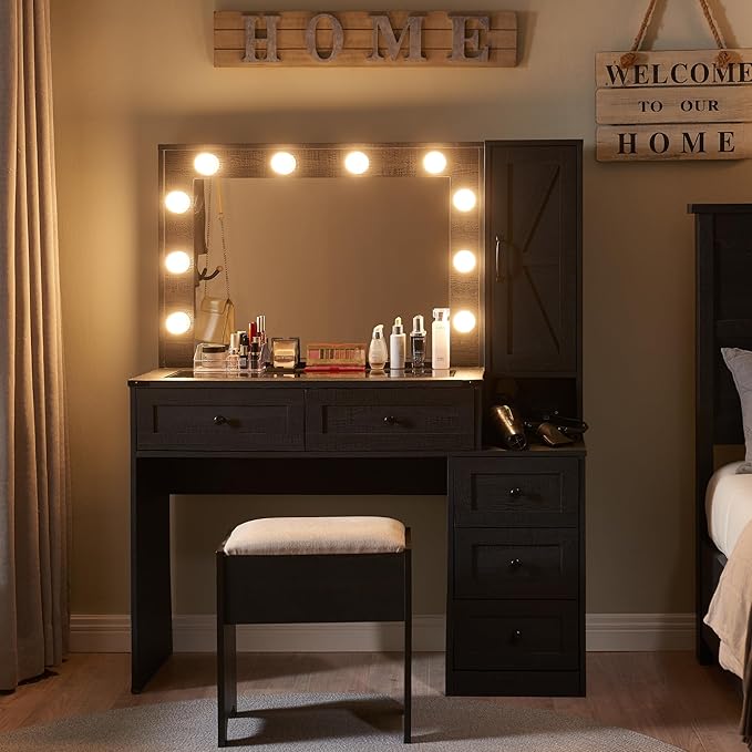 JXQTLINGMU Farmhouse Vanity Makeup Desk with Charging Station, 43" W Vanity Desk with Lights Mirror and Drawers for Makeup, Big Modern Makeup Table Set with Stool for Bedroom, Black