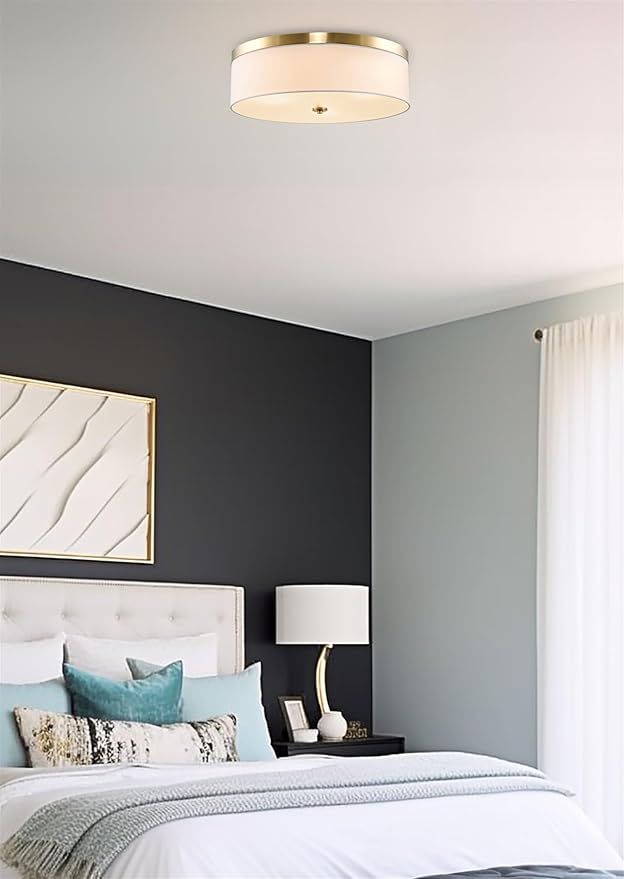 - [LOW-PROFILE MODERN DESIGN] The transitional drum ceiling light showcases a simple, modern design, featuring a gorgeous gold / cool brass finish and high quality white linen fabric drum shade. Complemented with a frosted white tempered glass diffuser, this close to ceiling light is easy on the eyes and eliminates glare. This versatile downlight can accommodate any decor, making it a prime choice among interior designers and builders for remodels and new construction projects.