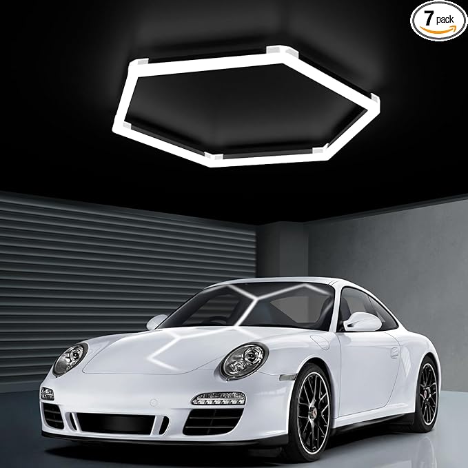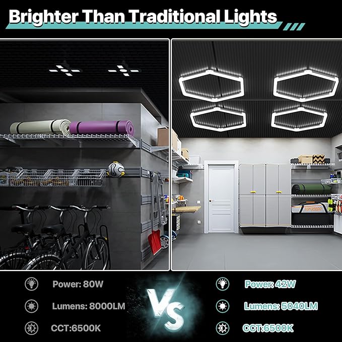 - SUPER BRIGHT & SOFT LIGHT - PC optical panel lampshade, high light transmittance, non-yellowing and high temperature resistance. Built-in high-quality LED chip, led hexagon garage light can emit 6500K natural white light, the light is stable, no flicker, no glare, and not hurt the eyes. Ideal hexagon LED lighting system for garages, shops, basements, repair shops, car washes, storage rooms.