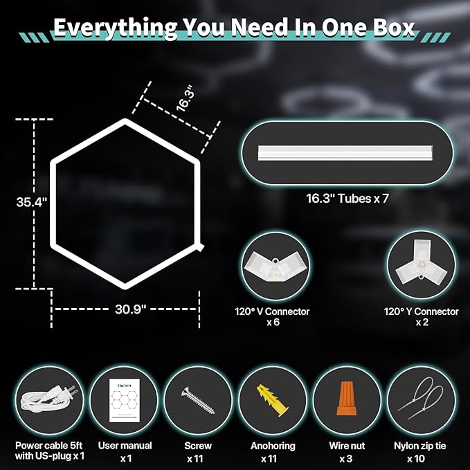 - DIY & QUICK INSTALLATION - Hex led garage ceiling lights are made of ultra-light materials and are designed to be installed quickly by one person. Quick-plug power connection method, automatic locking without manual connection, plug and play. The honeycomb lights is composed of 7 LED light tubes, equipped with 6 V-shaped connectors, 2 Y-shaped connectors, a 5ft power cord with an American plug, and other installation accessories to meet your different DIY assembly needs.