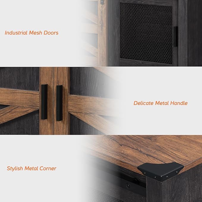 - Sliding Barn Doors:Our two sliding barn doors are designed with a special quality metal barn door pattern. Easy access to cabinets and shelves via metal track,,slide smoothly and quietly.