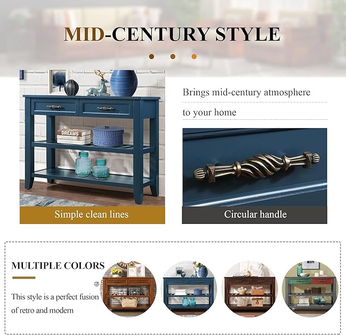 42inch Mid-Century Wood Console Table with 2 Drawers and 2 Bottom Shelf Sofa Table Solid Wood Sideboard(Navy Blue)