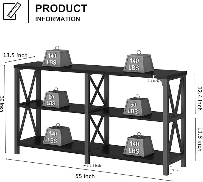 LVB Black Console Table, Modern Entryway Table with 3 Tier Storage Shelves, Industrial Sofa Table Behind Couch for Living Room, Farmhouse Wood Metal Entry Table for Hallway Foyer, Black Oak, 55 Inch
