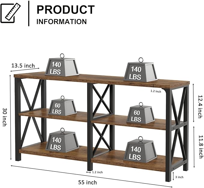 LVB Wood Console Table, Rustic 3 Tier Sofa Table Behind Couch, Industrial Metal Entryway Table with Storage Shelf, Farmhouse Wooden Foyer Hallway Table for Entry Living Room, Rustic Brown, 55 Inch