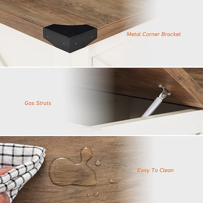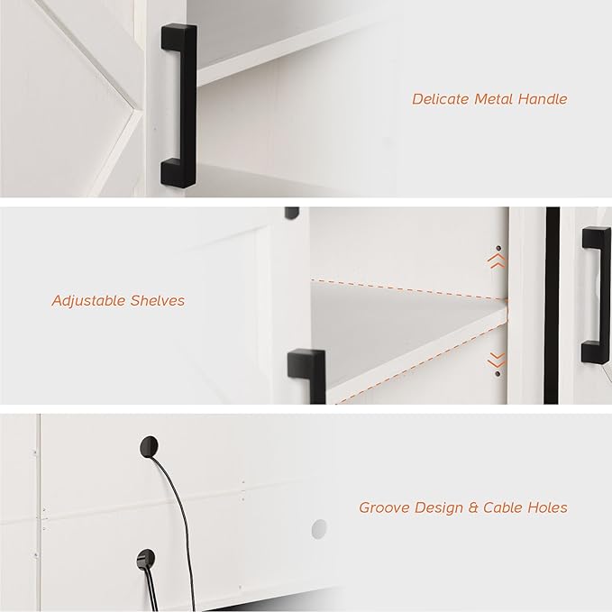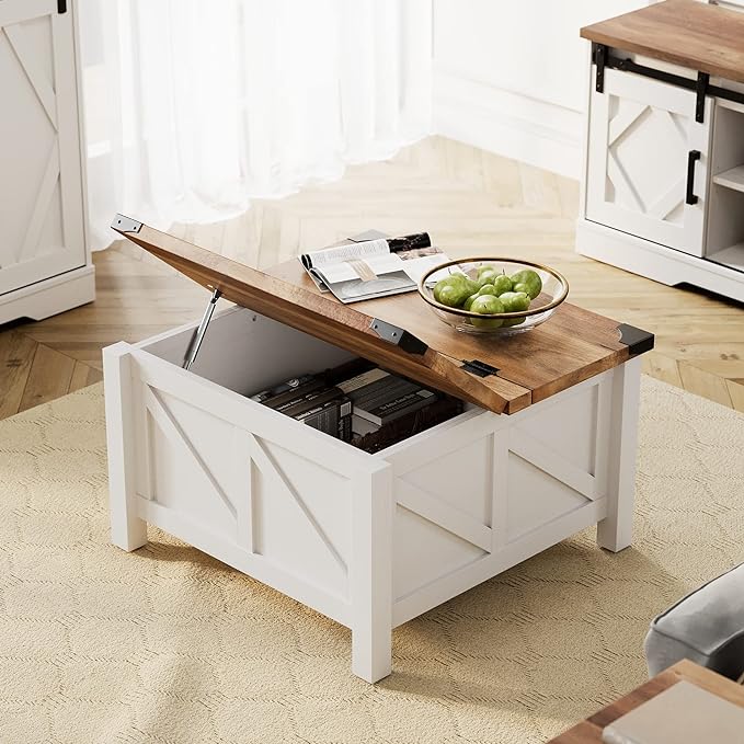- Large Storage Spaces:This television stand comes with 2 cabinet storage spaces with barn doors and 2 open spaces with a 3-level adjustable in the middle, providing abundant storage or display space for CDs, DVDs, gaming box, decorations, etc..The large square coffee table comes with a hidden storage cabinet of 136L space for organizing and storing your daily necessities. Spacious table top (30 "L x 30 "W) for all your daily needs.