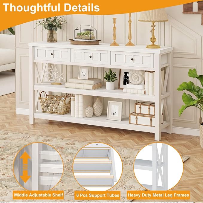 - [Impressive Stability & Weight Capacity] With its high-grade materials and the addition of six support tubes, this farmhouse hallway entry table offers enhanced weight capacity. It stands stable and secure after assembly, with the sofa table top supporting up to 240 lbs. Additionally, each of the two lower shelves boasts a weight capacity of 160 lbs, while the drawers can handle up to 50 lbs each