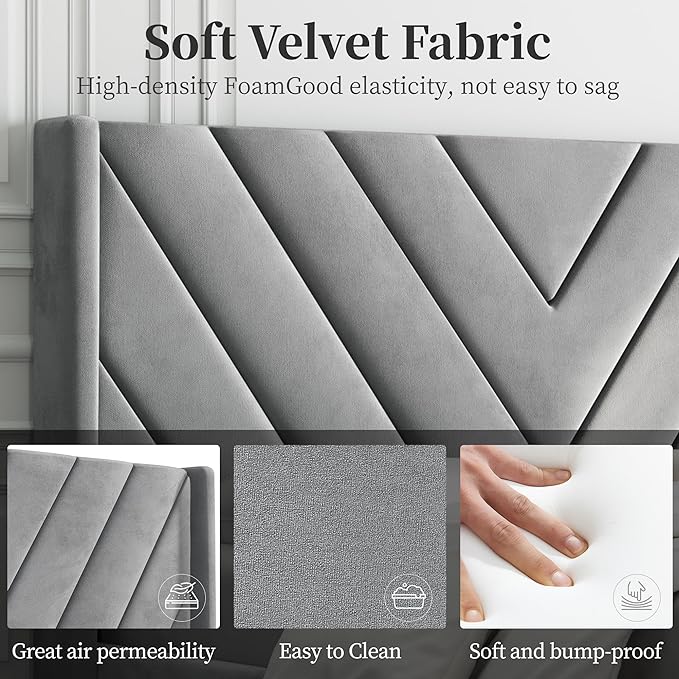 - Wing Side Design: Designed with a wing side on the wide upholstered headboard and skin-friendly velvet fabric, the queen bed frame can be a must-have in any restful retreat. (No Box Spring Needed)