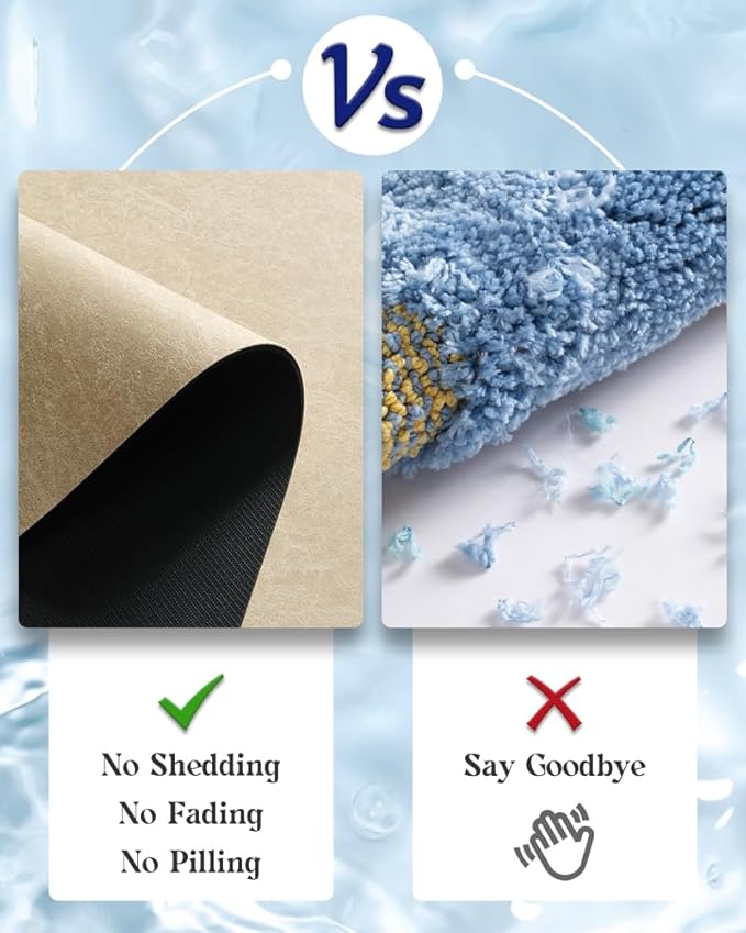 - DURABLE:These bathroom mats are designed with a Faux suede surface. You will never be bothered by fiber dropping or fuzzy pilling problems like traditional chenille bathroom floor mats. Therefore, this bath rug is much more durable without problems caused by fibers, like shedding, fading, wearing, dirt or hair hiding