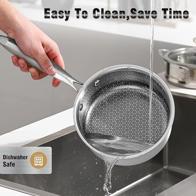 - Practical & Healthy: The sauce pan is made of high quality 18/10 stainless steel, which is strong and durable to prevent scratches, corrosion, warping and rusting. A honeycomb carving is etched into the interior of the cookware, making it 10 times more non-stick than traditional stainless steel pans! Non-toxic, Free of PTFE, PFOA, PFAS, lead, cadmium and other toxic substances.