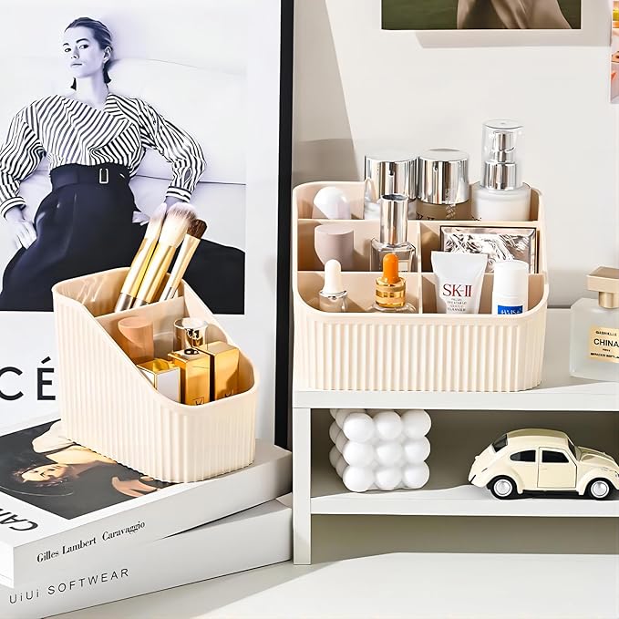 DASITON Large Capacity Makeup Brush Holder,3 Slots Makeup Brush Cup,Vintage striped Make Up Brush Holder,for Vanity Decor,Bathroom Countertops,Desk Storage Container,Cosmetic Display cases(Cream)