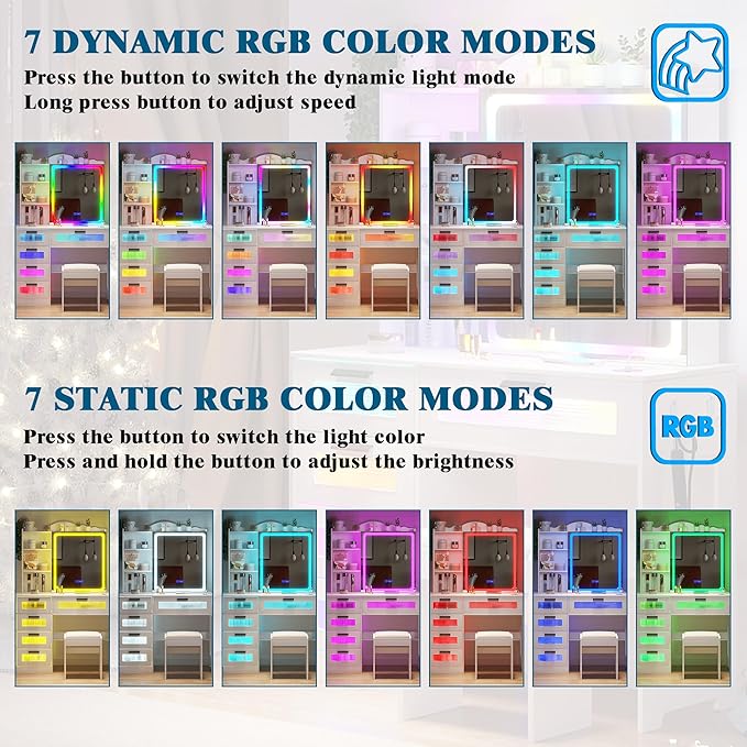 - ✅【Dancing RGB lights】The modern vanity has 7 kinds of dynamic and static lights. In the dynamic mode, short press can change the light color, and long press can adjust the speed. In static mode, short press can switch the light color, and long press can adjust the speed. In addition, we are also equipped with a remote control to allow you to change the light color you want at any time