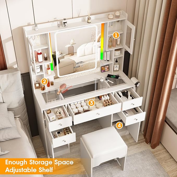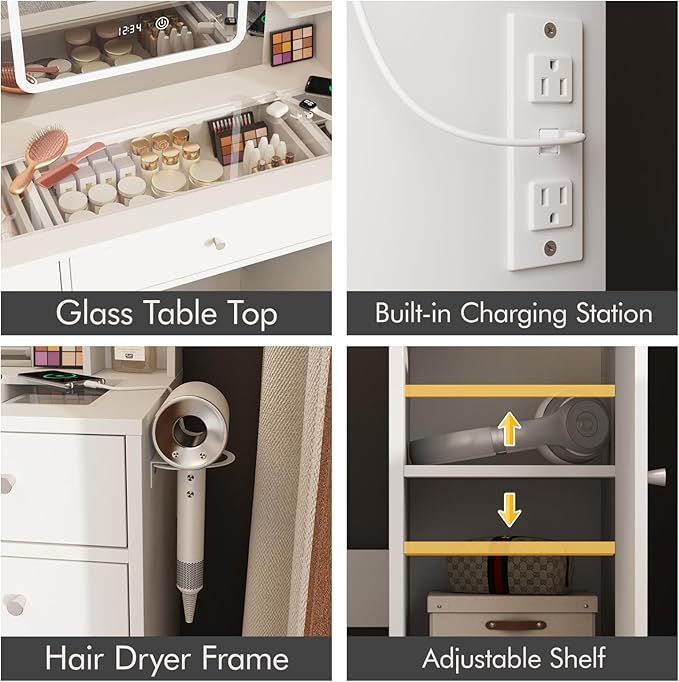 - [ Vanity with Lots of Storage ]: This vanity desk with mirror and lights has a wide glass table top and 5 drawers, 4 open shelves, has enough space to storage. You are easily find your cosmetics, jewelry and other beauty supplies. Make your room more neat and elegant.